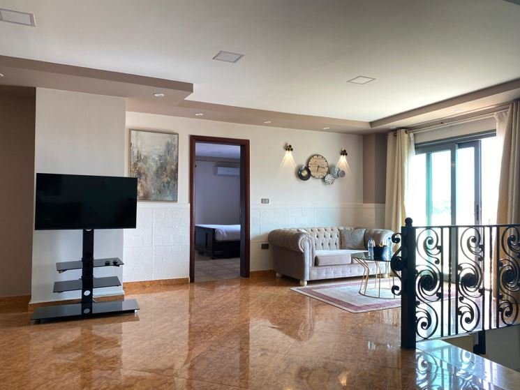 This unit is ideal for large families or your private events. The ground floor comprises a bedroom with an ensuite bathroom, a guest toilet, a separate kitchen, a dining room, a living room, and an American bar. Upstairs, there are two bedrooms with ensuite bathrooms, a living area or reading nook, and two balconies with stunning city views.
